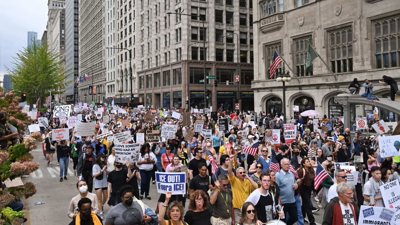 شيكاغو: في قلب حملة ترامب على الهجرة، احتشد الآلاف حاملين لافتات محلية الصنع وملصقات "ابتعدوا عن شيكاغو"، ملوحين بالأعلام الأمريكية المقلوبة إلى جانب بعض أعلام المكسيكيين، وقال المتظاهرون لشبكة CNNإن مداهمات الهجرة وتخفيضات برنامج Medicaid وسياسات أخرى كانت من بين أسباب التظاهر يوم السبت.